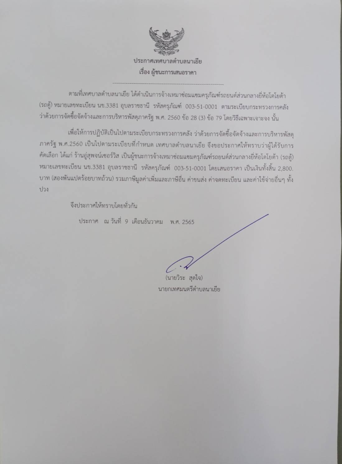 ประกาศผู้ชนะการเสนอราคา จ้างเหมาซ่อมแซมครุภัณฑ์รถยนต์ส่วนกลางยี่ห้อโตโยต้า (รถตู้)หมายเลขทะเบียน นข 3381 (สป.)