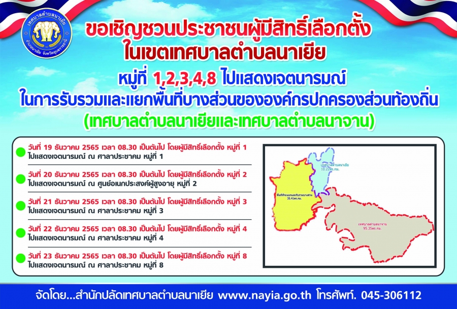 ประกาศเทศบาลตำบลนาเยีย เรื่อง การจัดให้มีการสำรวจเจตนารมณ์ประชาชนในพื้นที่เทศบาลตำบลนาเยีย ในการรับรวมพื้นที่บางส่วนของเทศบาลตำบลนาจาน หมู๋ 1,2,3,4 และ 8 มารวมกับเทศบาลตำบลนาเยีย